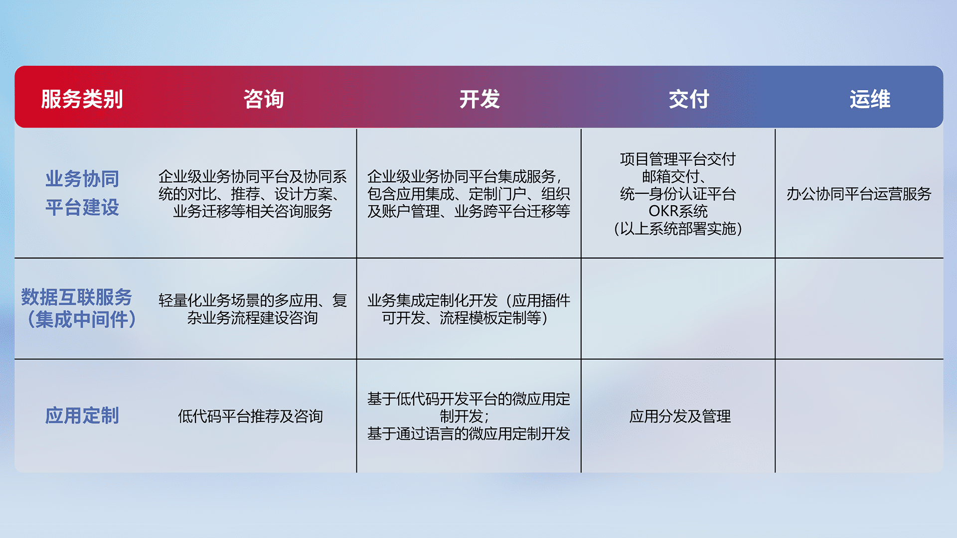 针对钉钉、、企微、、、IDaas等平台级产品提供产品的规划、、方案、、、交付、、、定制化开发等服务,,,实现如统一协同办公、、、智能客户服务、、、、混合会议管理、、智能数据查询、、等业务场景,,,,实现数字化转型。。