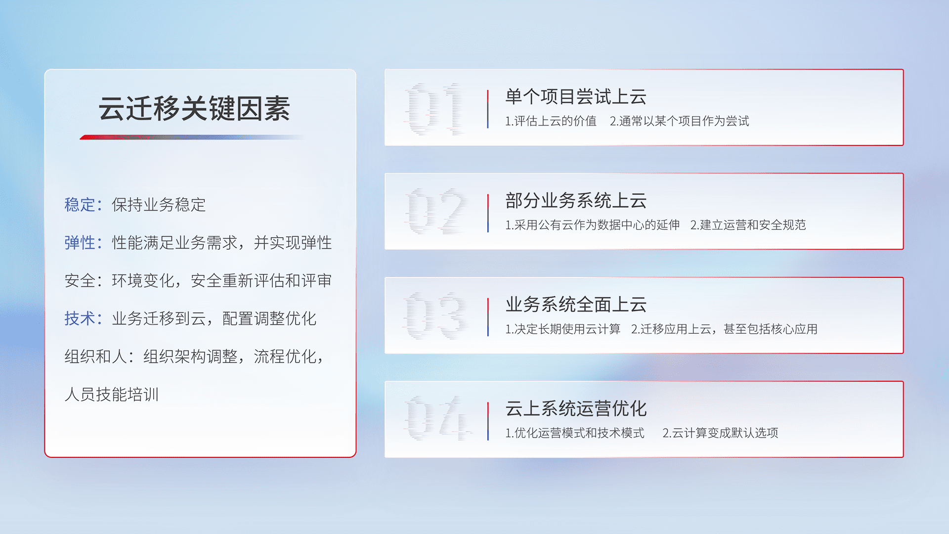 结合实际业务,,,,从规划设计、、、云平台选型、、、云原生改造、、数据迁移、、、集成交付,,,,迁移全过程为客户识别最佳上云路径,,,做好风险识别管理,,设计网络架构、、、身份权限、、安全审计合规、、、操作审计、、、日志审计、、、、监控告警策略、、、多站点容灾设计等,,对云上基础设施进行整体规划,,提升IT治理水平,,,,以满足弹性、、、、高可用、、高性能的需求。。。。