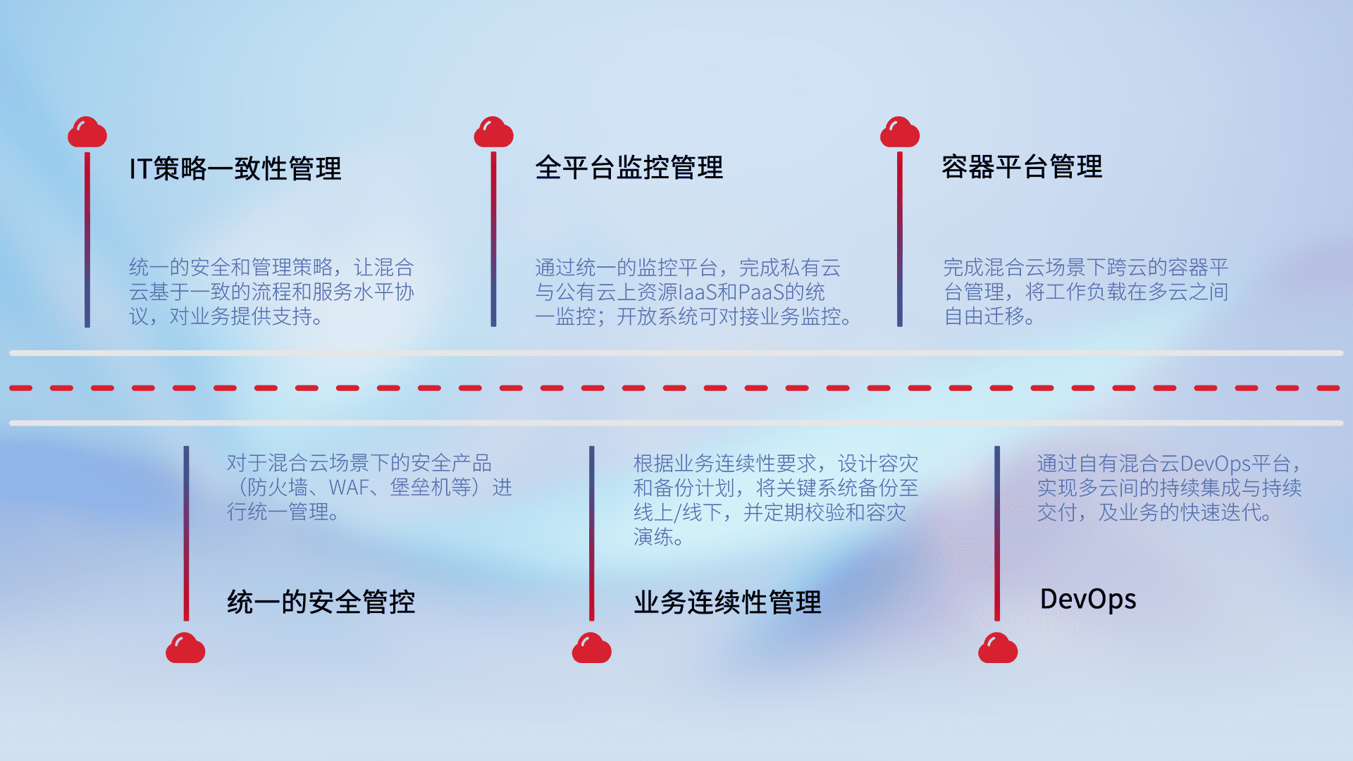 通过多云纳管,,,以统一的资源数据模型把客户的云资源进行抽象和封装,,,进而实现对多云资源的统一操作,,,保障云资源管理的可靠性、、、、稳定性与可用性。。。。量身定制化运维内容,,,,配置、、、开发运维、、、补丁管理、、、、备份、、、、监控、、、、认证和访问管理、、审计和日常巡检等,,保障在用云过程中的可靠度,,,稳定度以及高可用率。。。
