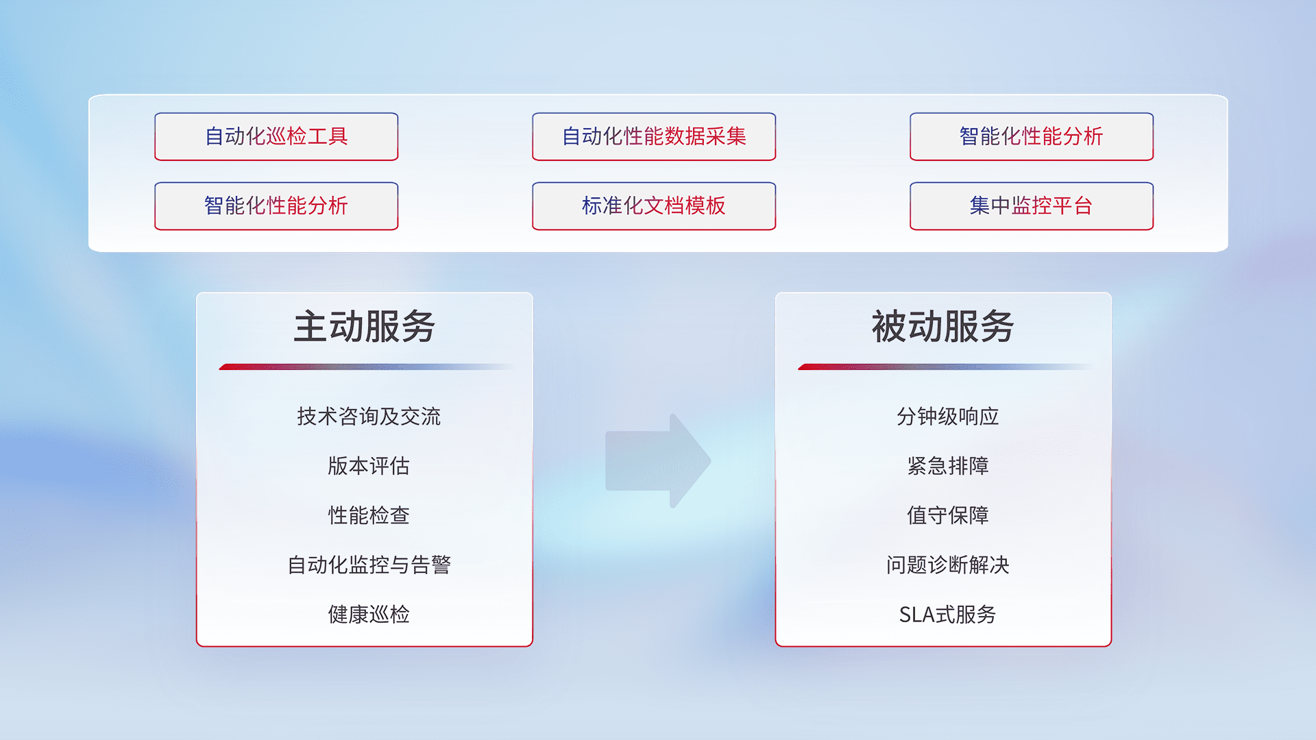 智能化工具和标准化文档,,,保障服务质量,,,提供主动服务(包含技术咨询、、、、版本评估、、性能检查、、、自动化监控与告警、、、、健康巡检)和被动服务包含(分钟级响应、、、、紧急排障、、值守保障、、问题诊断解决、、、SLA服务)。。